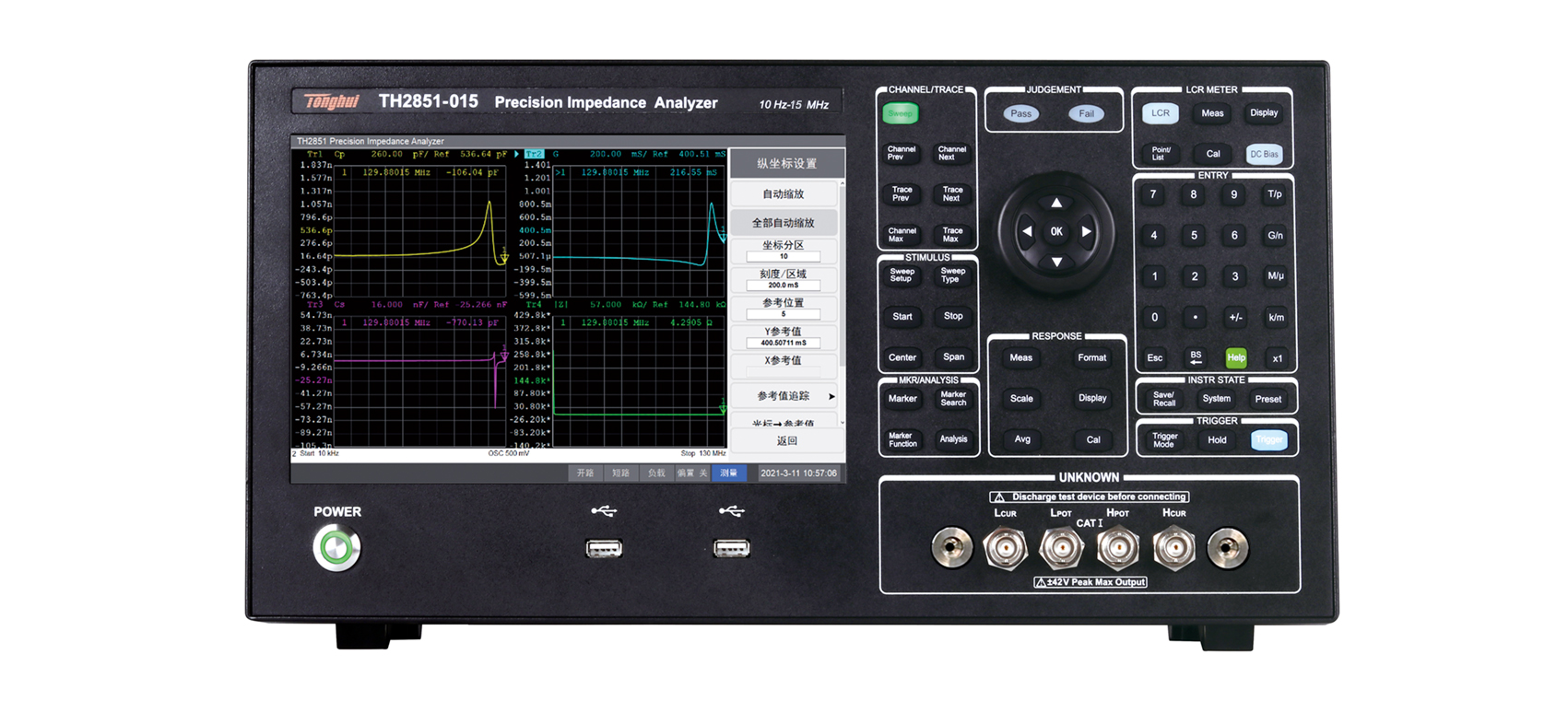 TH2851系列阻抗分析仪也越了国外同类仪器120MHz的频率瓶颈;解决了国外同类仪器只能分析、无法单独测试的缺陷;中英文操作界面也解决了国外仪器仅有英文界面的尴尬;采用单测和分析两种界面,让测试更简单。