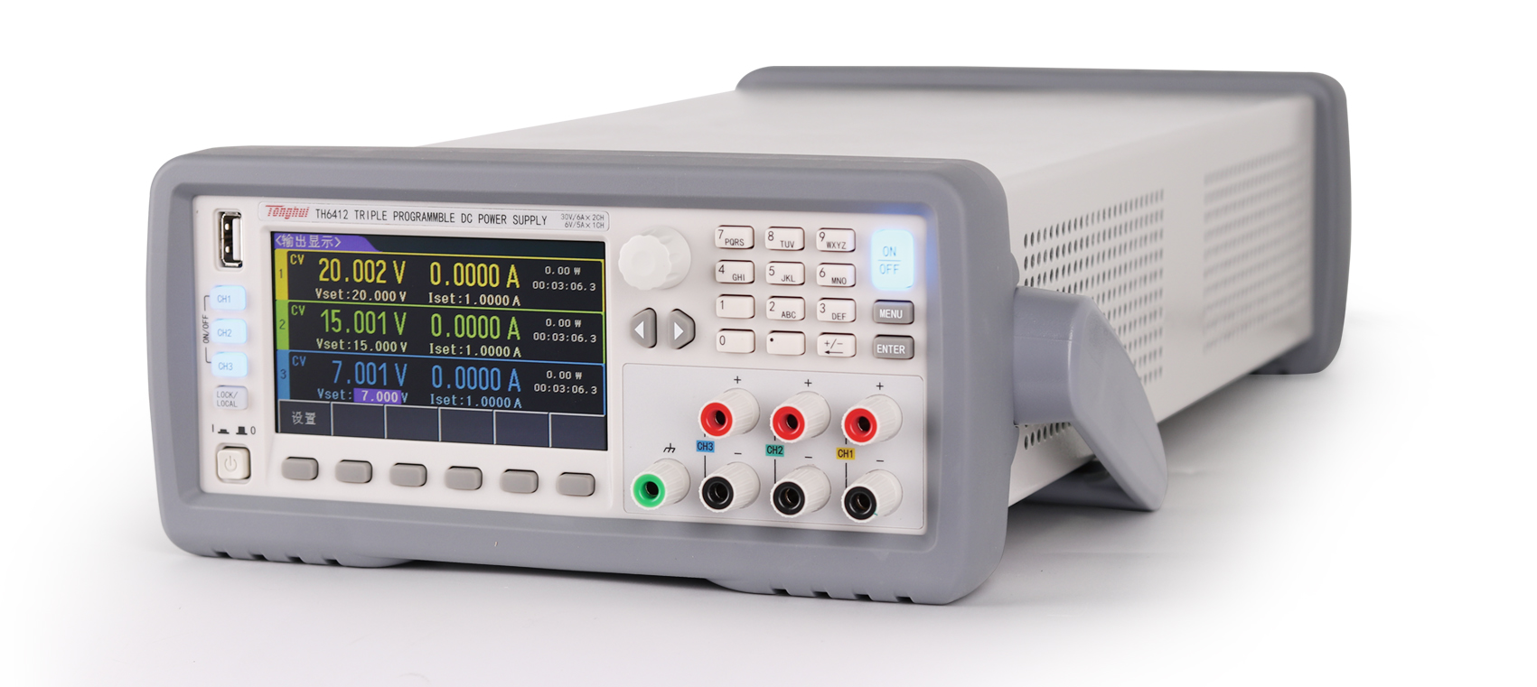 TH6400系列多路输出可编程直流电源涵盖了5个型号(单个通道功率范围5W-180W),其中TH6402B为4通道输出,其余型号为3通道输出。全系列电源具备通道间串、并联以及同步输出功能,并且有通道的输出参数同屏显示,使用起来更加方便、直观。
